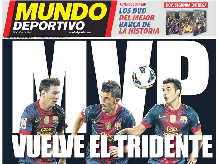 Η Mundo Deportivo έχει φωτογραφία στην πρώτη σελίδα τους Μέσι, Βίγια και Πέδρο την “τρίαινα” της Μπάρτσα όπως αναφέρει η εφημερίδα, ενώ ο Ισπανός ποδηλάτης Contandor έχει κερδίσει το πρωτοσέλιδο της Marca.