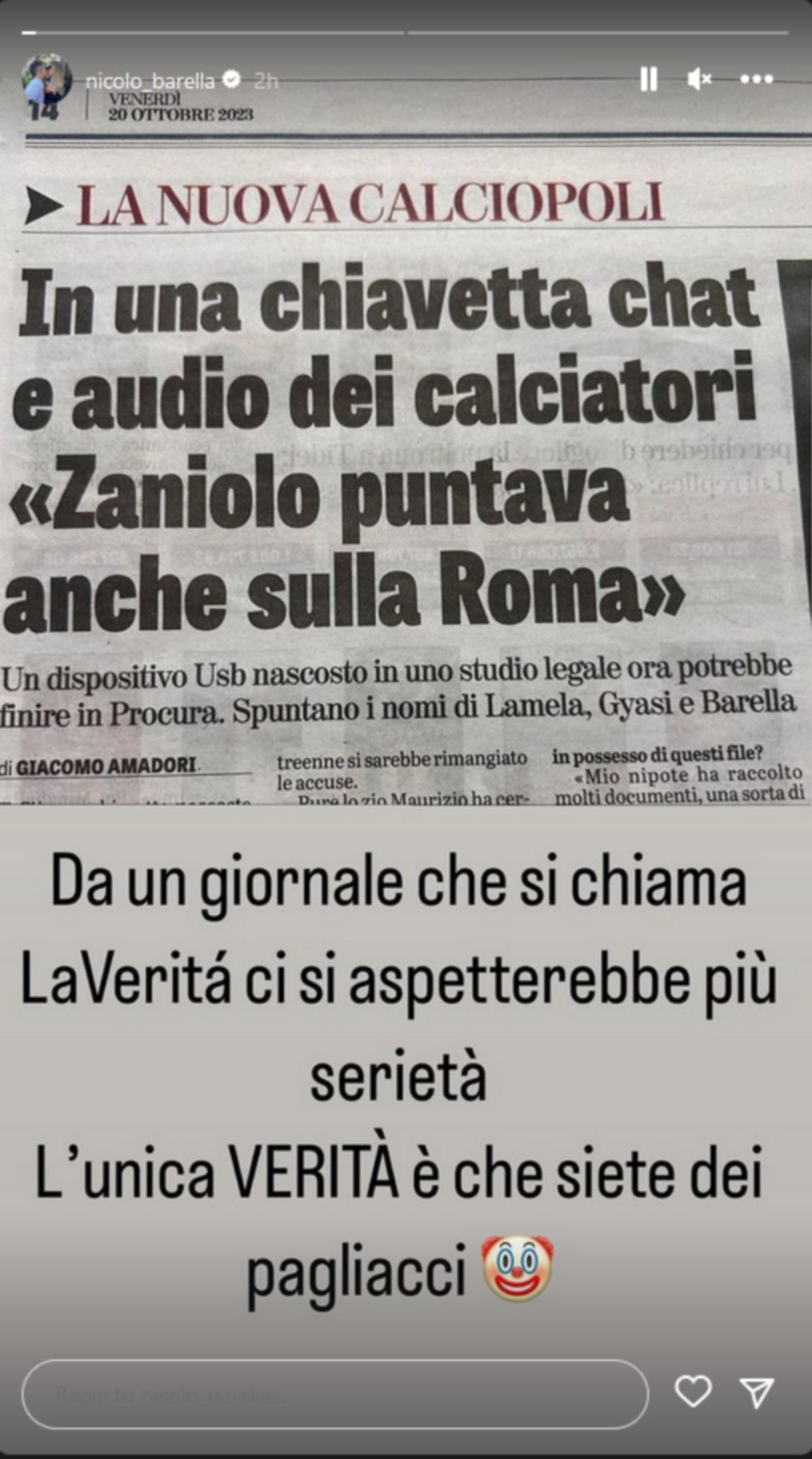 Την ώρα πάντως που ακούγονται δεξιά και αριστερά διάφορα ονόματα εμπλεκομένων στη συγκεκριμένη υπόθεση, ο Νικολό Μπαρέλα είδε το δικό του να αναφέρεται σε δημοσίευμα της εφημερίδας “Verita” και αποφάσισε να απαντήσει δυναμικά, κάνοντας λόγο μεταξύ άλλων για… παλιάτσους.