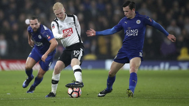 Derby County's Will Hughes, center, takes on Leicester City's Ben Chillwell, right, and Danny Drinkwater during the English FA Cup fourth round soccer match between Leicester City and Derby County at Pride Park, Derby, England, Friday, Jan. 27, 2017. (Nick Potts/PA via AP)