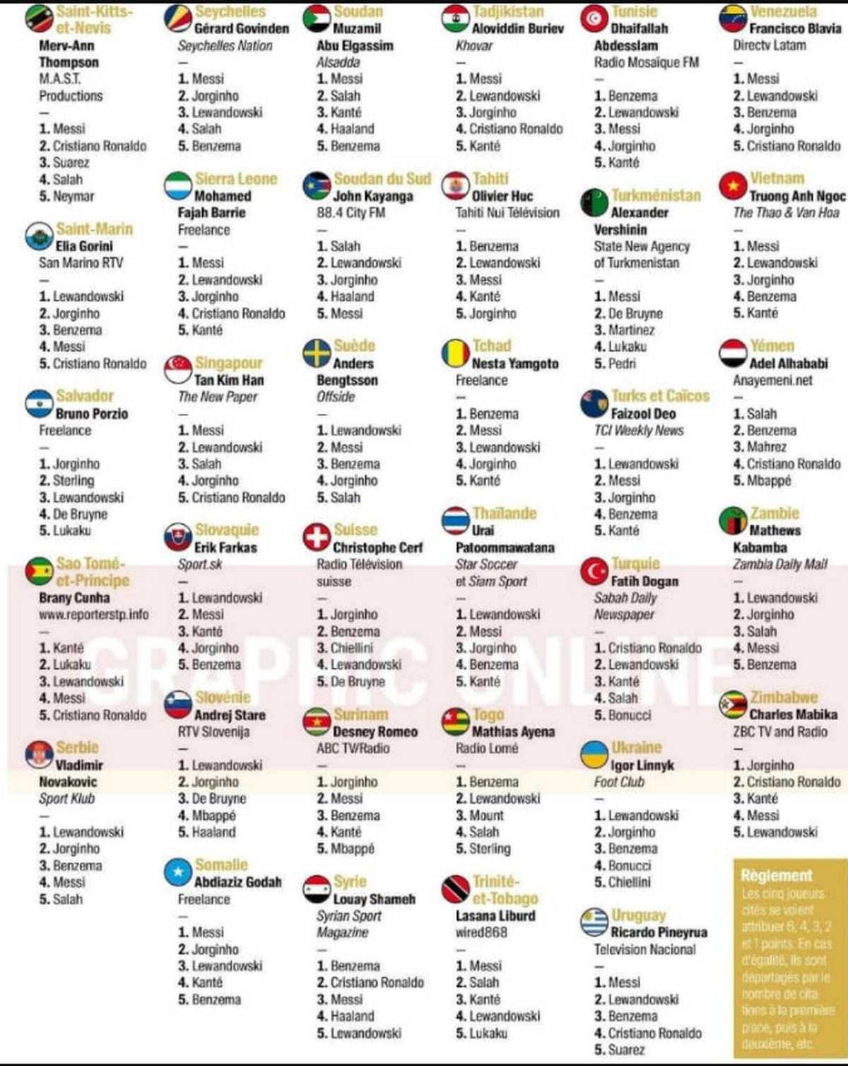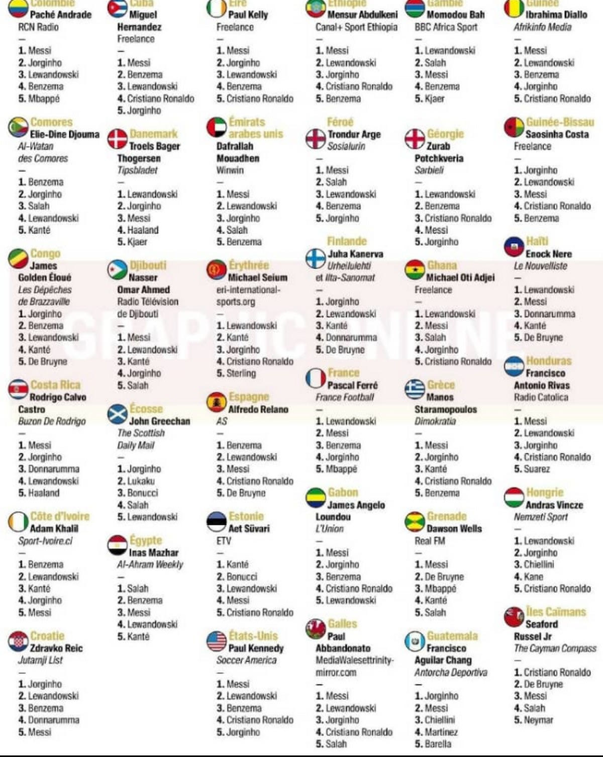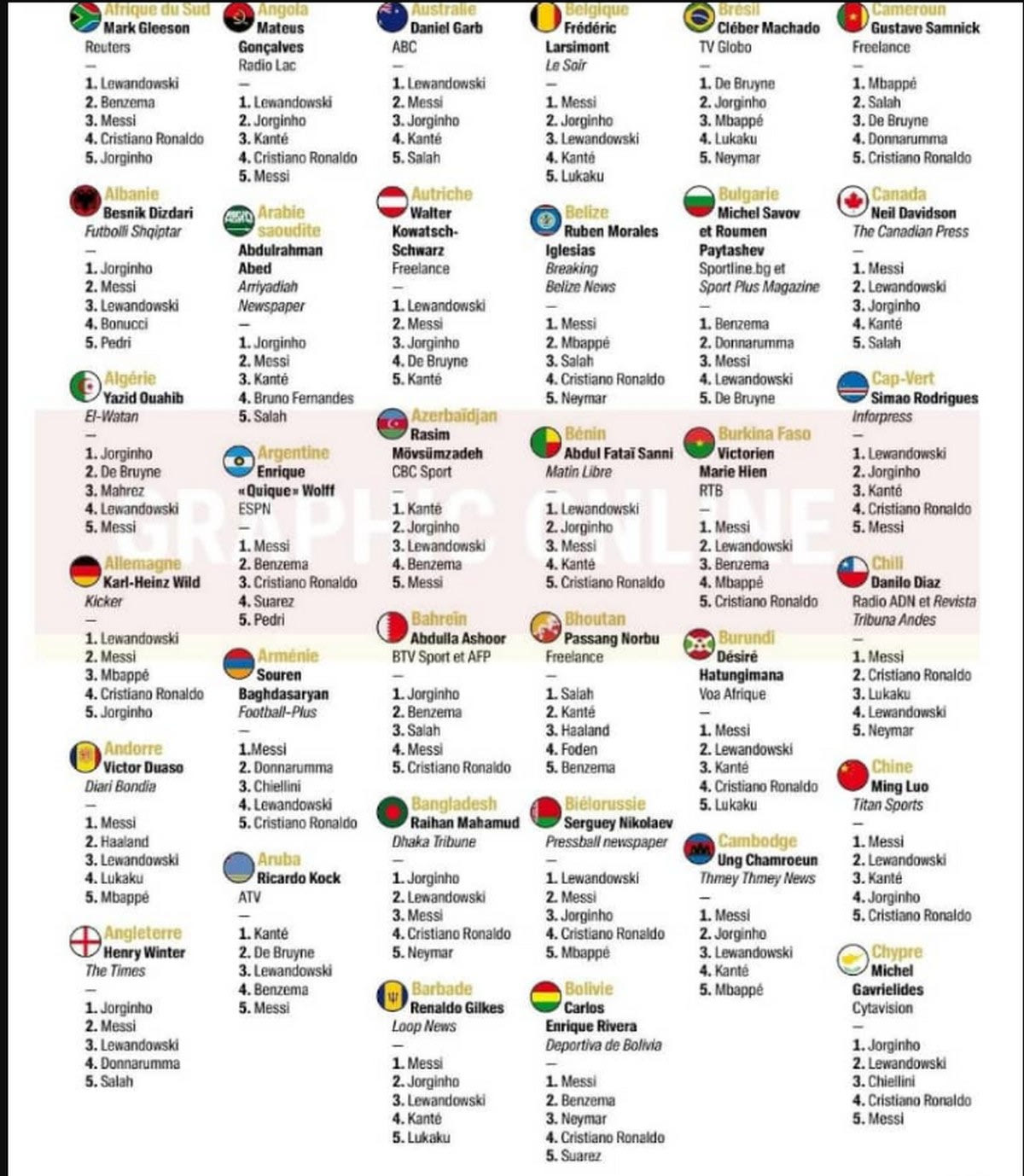 Αρκετές ήταν οι χώρες που επέλεξαν να δώσουν αλλού την πρωτιά τους, ενώ κάποιες άφησαν εκτός πεντάδας τους δύο πρωτοπόρους. Η Ελλάδα τοποθέτησε στην κορυφή τον Μέσι, ενώ εκτός πεντάδας έμεινε ο Πολωνός στράικερ της Μπάγερν.