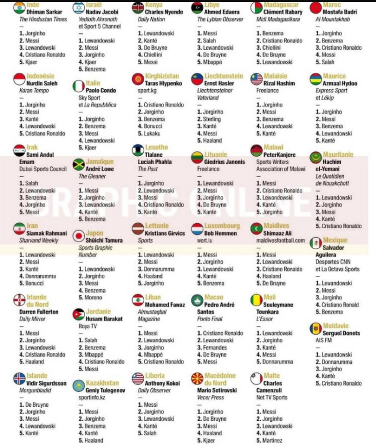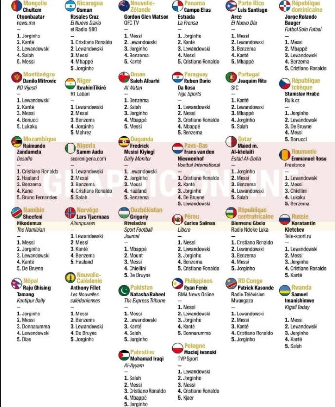 Ο Μέσι συγκέντρωσε 613 πόντους, ο Λεβαντόβσκι 580, ενώ ο Ζορζίνιο 460. Έχει, ωστόσο, μεγάλο ενδιαφέρον ο τρόπος με τον οποίοι ψήφισαν οι δημοσιογράφοι των 180 χωρών.