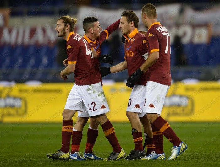 Ο Παναγώτης Ταχτσίδης (δίπλα στον Φραντσέσκο Τότι) πανηγυρίζει ένα από τα τέσσερα γκολ της Ρόμα με αντίπαλο τη Φιορεντίνα