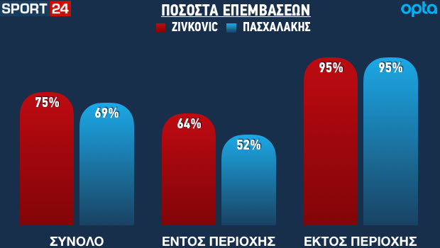 Εκεί ο Ζϊβκοβιτς έχει πει όχι στο 64% των τελικών που έχει αντιμετωπίσει και ο Πασχαλάκης μόλις στο 52%.