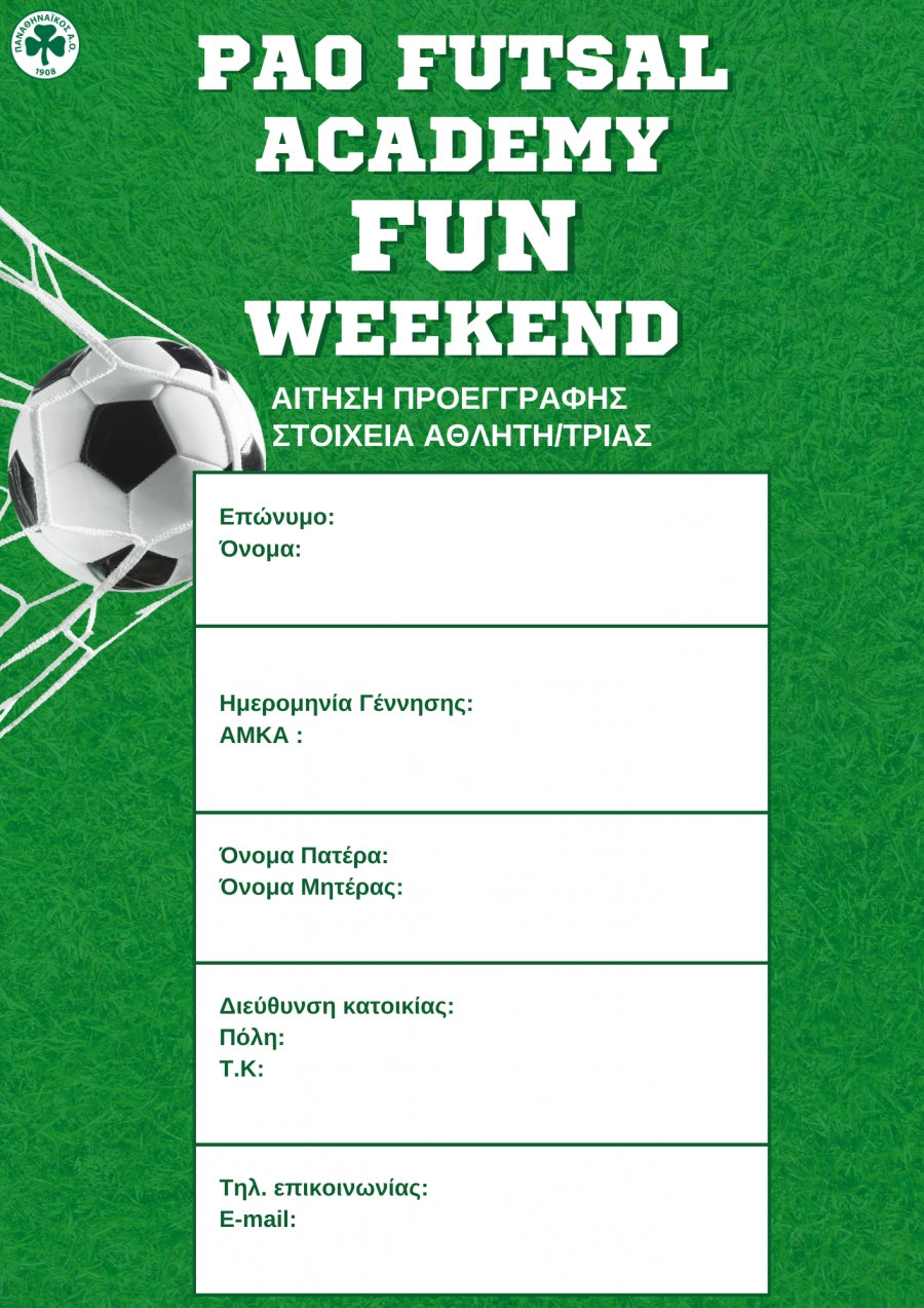 Ο Παναθηναϊκός Αθλητικός Όμιλος, στο ποδόσφαιρο σάλας αγωνίζεται στη Stoiximan Futsal Super League μετά την άνοδό του φέτος και ανακοίνωσε τη διοργάνωση Fun Weekends τον Ιούνιο για τη στελέχωση των ακαδημιών Futsal.
