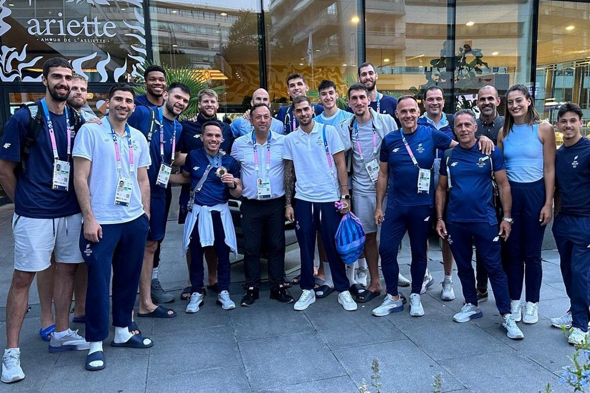 Η αποστολή της Εθνικής μπάσκετ έπεσε πάνω στον Λευτέρη Πετρούνια λίγη ώρα μετά από την κατάκτηση του χάλκινου μεταλλίου στους κρίκους και τον αποθέωσε σε εστιατόριο του Παρισιού.