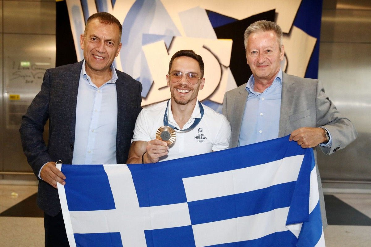 Στην άφιξη του χάλκινου ολυμπιονίκη του Παρισιού βρισκόταν -μεταξύ άλλων και- ο αναπληρωτής υπουργός Αθλητισμού Γιάννης Βρούτσης.