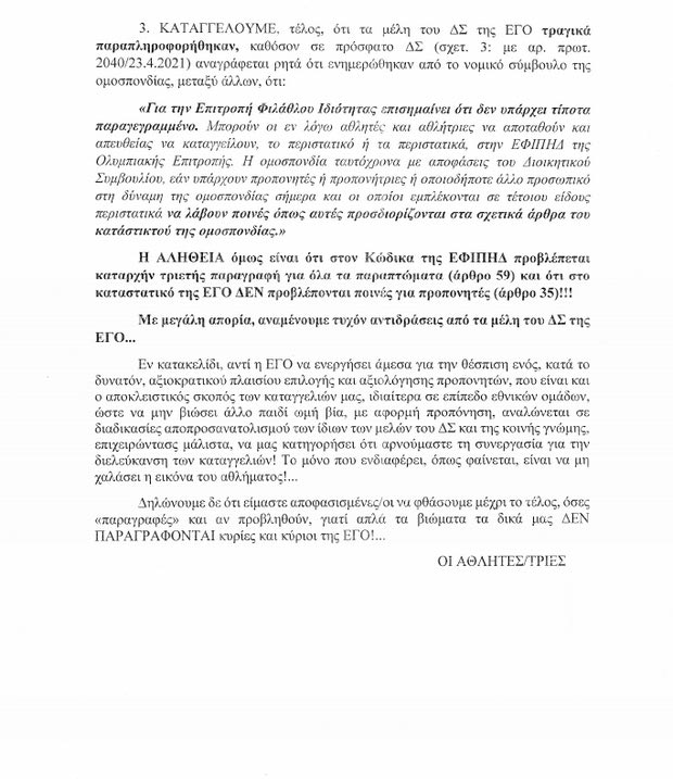 Κλείνοντας οι αθλητές προχωρούν και σε μία ακόμη καταγγελία. Τονίζουν ότι “τα μέλη του ΔΣ της ΕΓΟ τραγικά παραπληροφορήθηκαν”, επισημαίνοντας ότι “σε πρόσφατο ΔΣ αναγράφεται ρητά ότι ενημερώθηκαν από το νομικό σύμβουλο της ομοσπονδίας μεταξύ άλλων ότι: