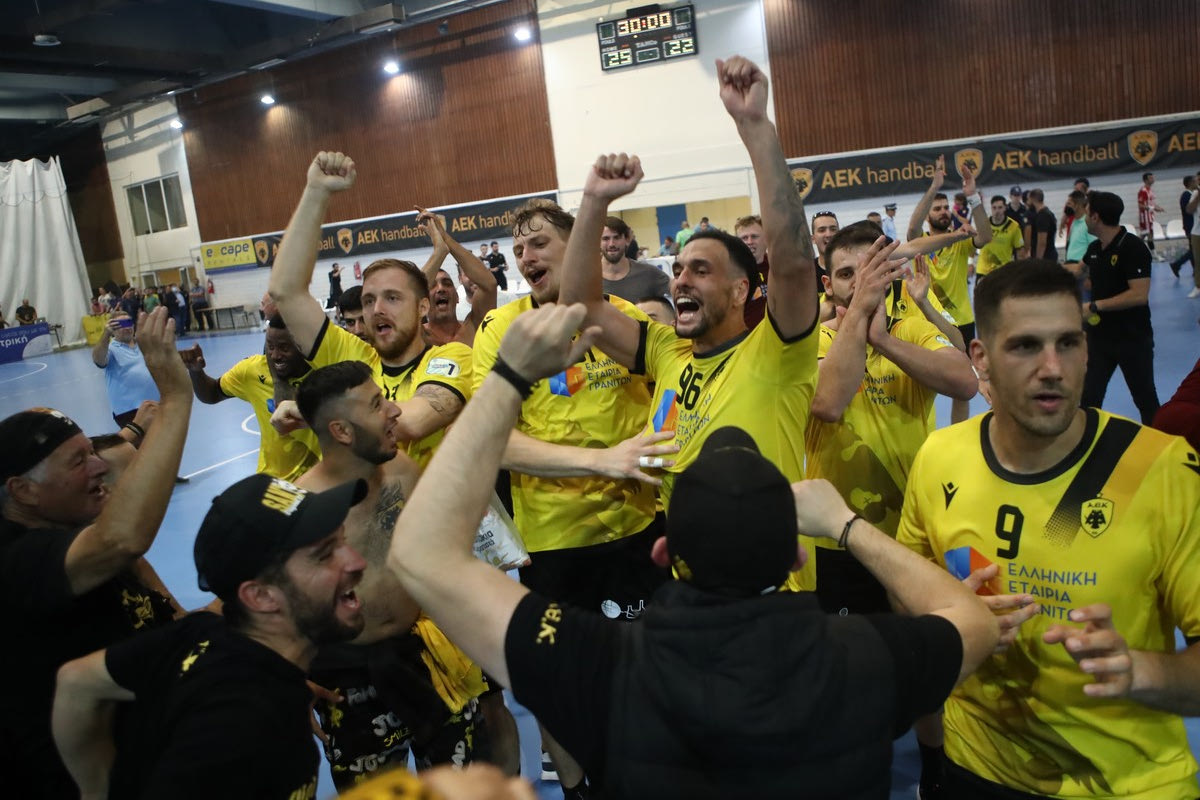 Η ΑΕΚ πήρε το ντέρμπι απέναντι στον Ολυμπιακό στην πρεμιέρα της Handball Premier, με τους παίκτες της Ένωσης να πανηγυρίζουν με τον κόσμο της ομάδας.