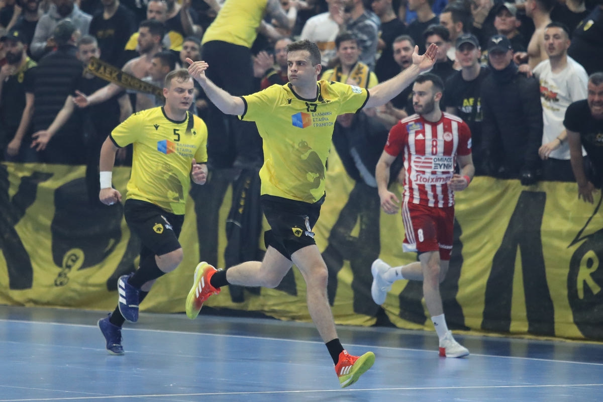 Με όπλο την άμυνά της και την τριάδα των Μαντάλινιτς, Ηλιόπουλου και Μάτσκεβιτς σε μεγάλη ημέρα η ΑΕΚ επικράτησε 23-19 του Ολυμπιακού και έκανε το 2-1 στη σειρά των τελικών της Handball Premier.