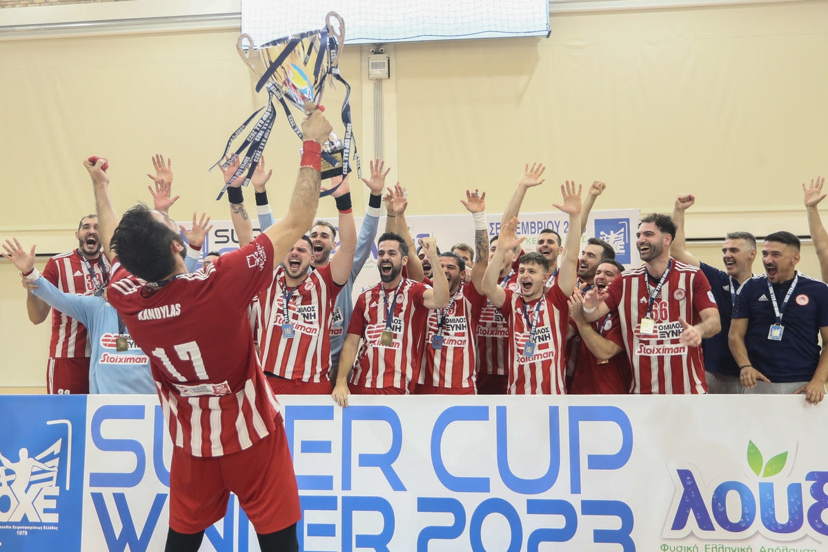 Οι παίκτες της ομάδας χάντμπολ του Ολυμπιακού σηκώνουν το τρόπαιο του Super Cup μετά τη νίκη τους στον τελικό επί της ΑΕΚ | 18 Σεπτεμβρίου 2023
