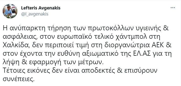 Αναλυτικά όσα ανέφερε ο Λευτέρης Αυγενάκης στο Twitter: “Η ανύπαρκτη τήρηση των πρωτοκόλλων υγιεινής και ασφάλειας, στον ευρωπαϊκό τελικό χάντμπολ στη Χαλκίδα, δεν περιποιεί τιμή στη διοργανώτρια ΑΕΚ και στον έχοντα την ευθύνη αξιωματικό της ΕΛ.ΑΣ για τη λήψη και εφαρμογή των μέτρων. Τέτοιες εικόνες δεν είναι αποδεκτές και επισύρουν συνέπειες“.