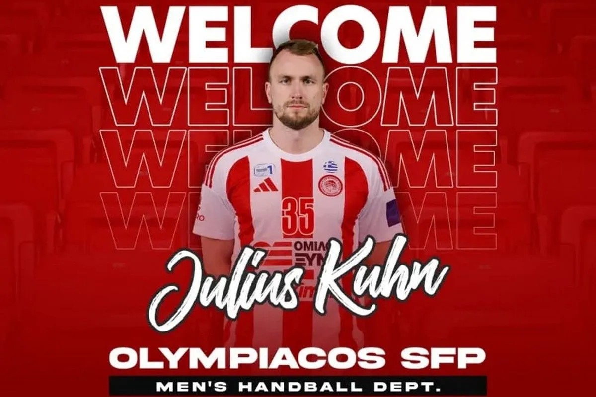 “Ο ΟΛΥΜΠΙΑΚΟΣ Σ.Φ.Π. ανακοινώνει την έναρξη της συνεργασίας του με τον Γιούλιους Κιουν. Ο διεθνής Γερμανός αριστερός ίντερ (1/4/1993, 1,98μ.) υπέγραψε το νέο του συμβόλαιο και εντάσσεται στο ρόστερ της ομάδας χάντμπολ του συλλόγου.