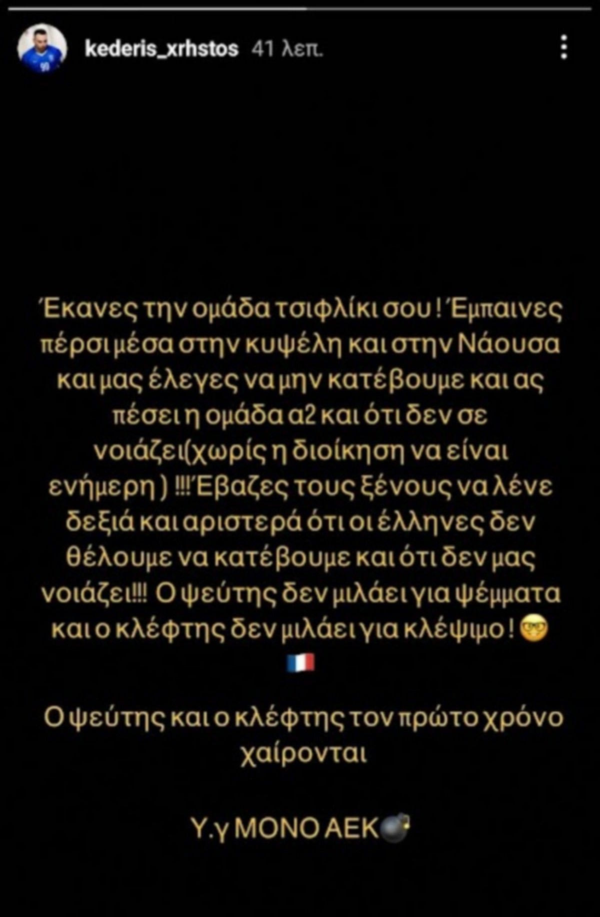 Έβαζες τους ξένους να λένε δεξιά και αριστερά ότι οι Έλληνες δεν θέλουν να κατέβουμε και ότι δεν μας νοιάζει. Ο ψεύτης δεν μιλάει για ψέματα και ο κλέφτης δεν μιλάει για κλέψιμο. Ο ψεύτης και ο κλέφτης τον πρώτο χρόνο χαίρονται. Υ.Γ: ΜΟΝΟ ΑΕΚ”, γράφει ο πρώην παίκτης της ΑΕΚ και θρύλος του τμήματος χάντμπολ ανδρών του συλλόγου.