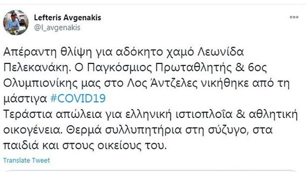 Και ο Υφυπουργός Αθλητισμού, Λευτέρης Αυγενάκης, μέσω του λογαριασμού του στο twitter θέλησε να στείλει τα δικά του συλλυπητήρια: “Απέραντη θλίψη για τον αδόκητο χαμό του Λεωνίδα Πελεκανάκη. Ο Παγκόσμιος Πρωταθλητής και 6ος Ολυμπιονίκης μας στο Λος Άντζελες νικήθηκε από τη μάστιγα του Covid 19.