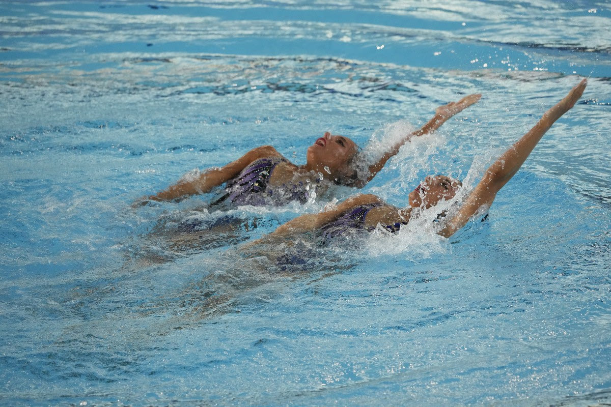Greece's Sofia Malkogeorgou and Evangelia Platanioti compete during the duet free final at the European swimming championships, in Rome, Saturday, Aug. 13, 2022. (AP Photo/Andrew Medichini)