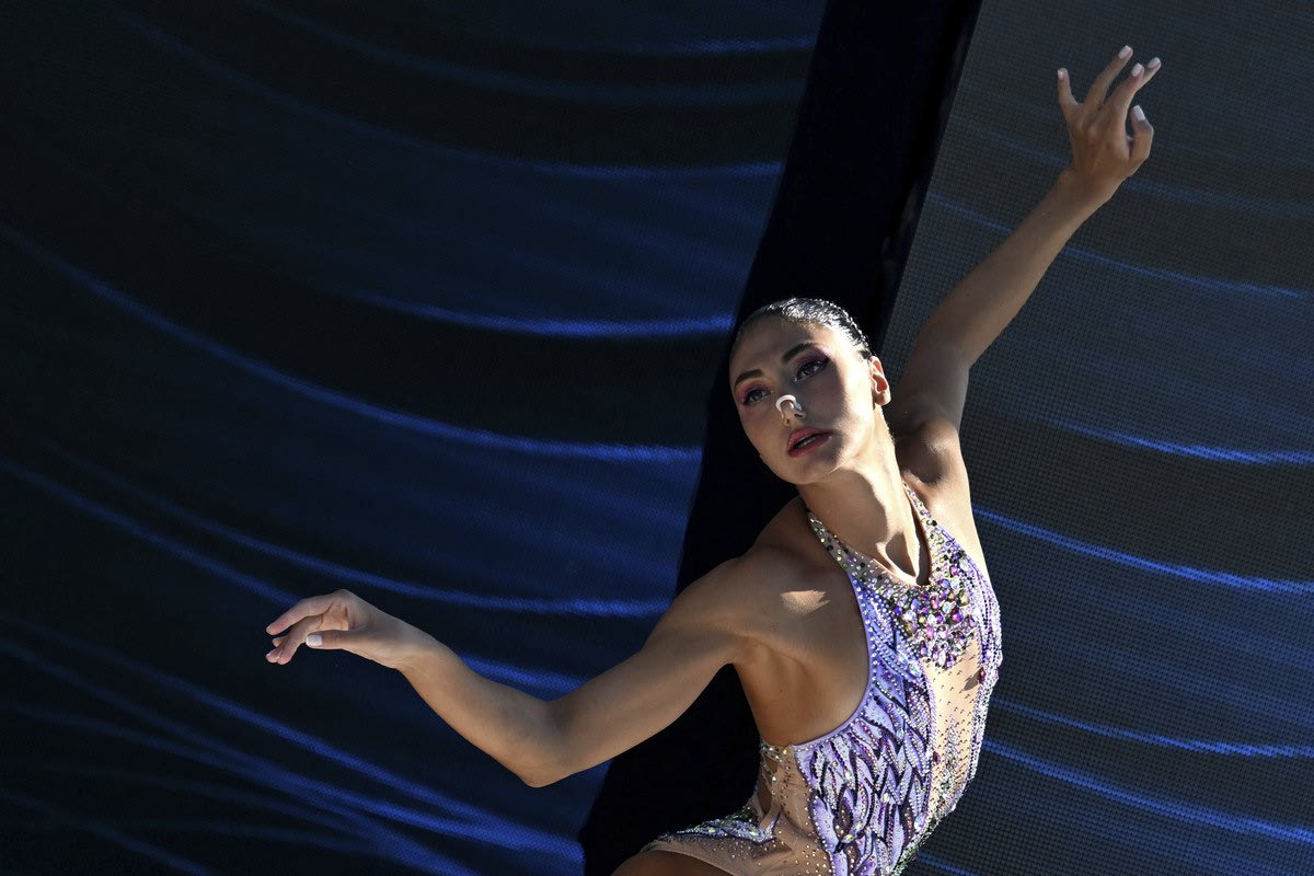 Greece's Evangelia Platanioti competes during solo technical final of artistic swimming at the 19th FINA World Championships in Budapest, Hungary, Saturday, June 18, 2022. (AP Photo/Anna Szilagyi)