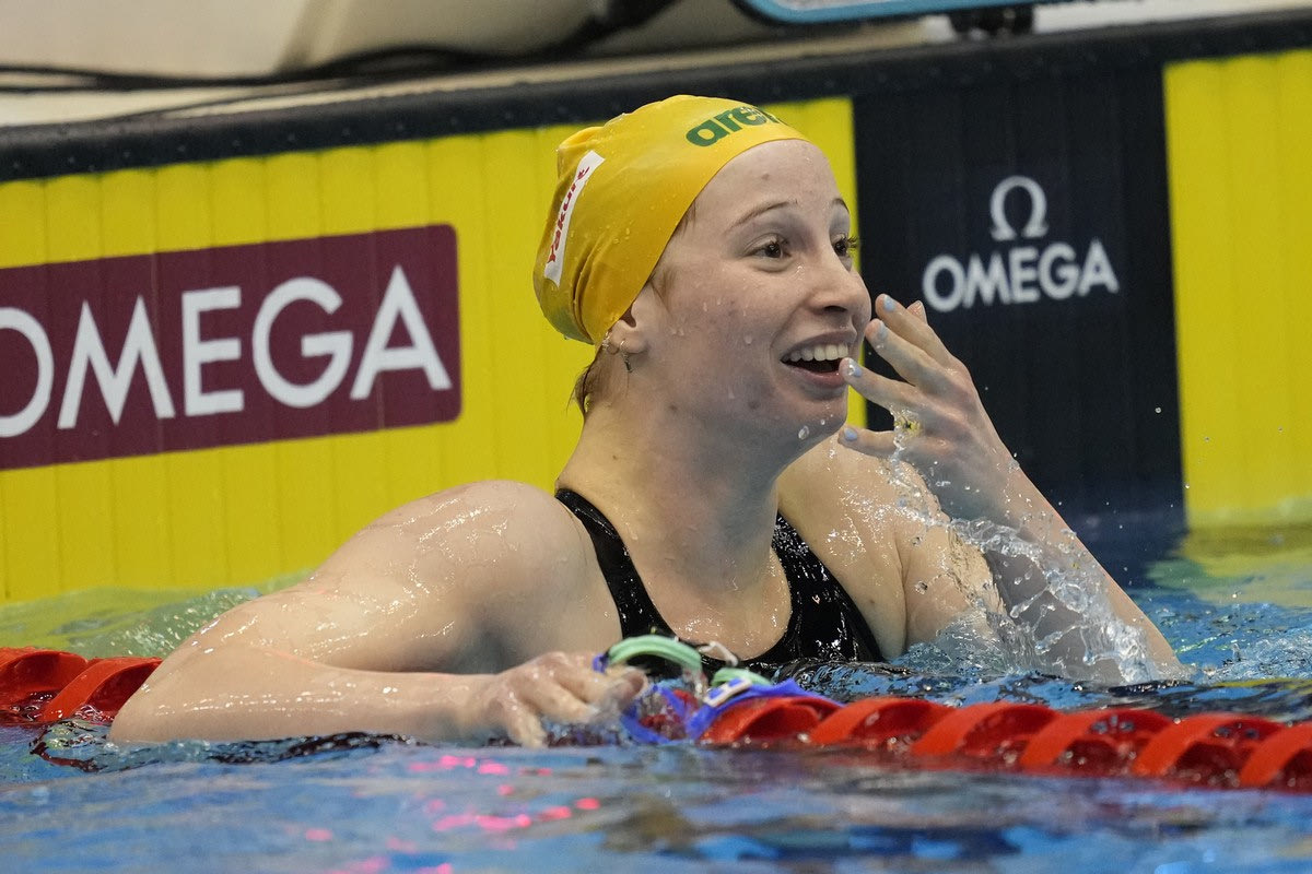 Mollie O'Callaghan of Australia reacts after winning the women's 200m freestyle swimming final at the World Swimming Championships in Fukuoka, Japan, Wednesday, July 26, 2023. (AP Photo/Lee Jin-man) AP