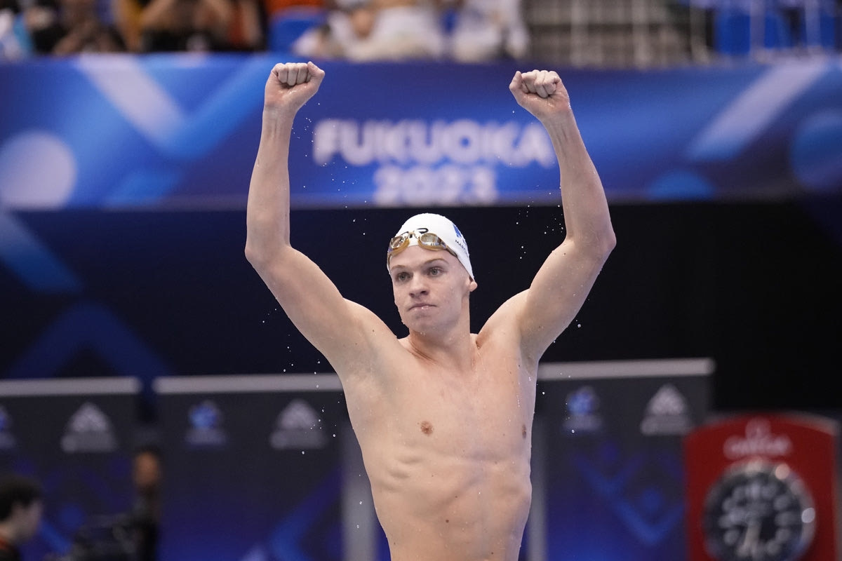 Leon Marchand of France celebrates after wining Men 400m Medley final at the World Swimming Championships in Fukuoka, Japan, Sunday, July 23, 2023. . (AP Photo/Eugene Hoshiko)
