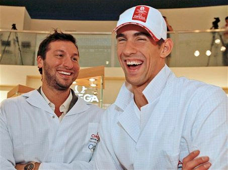 Swimming stars Ian Thorpe from Australia and Michael Phelps addresses the audience from the stage of the OMEGA Pavilion on the Olympic Green in Beijing, Wednesday, Aug. 20, 2008. (AP Photo/Photopress, Alexandra Wey) AP