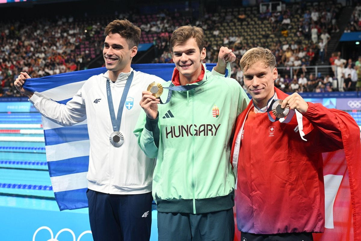 NANTERRE, FRANCE - AUGUST 01: Gold Medalist Hubert Kos of Team Hungary (C), Silver Medalist Apostolos Christou of Team Greece (L) and Bronze Medalist Roman Mityukov of Team Switzerland (R) pose for a selfie on the podium during the Swimming medal ceremony after the Men's 200m Backstroke Final on day six of the Olympic Games Paris 2024 at Paris La Defense Arena on August 01, 2024 in Nanterre, France. (Photo by Adam Pretty/Getty Images) Oli Scarff, gettyimages