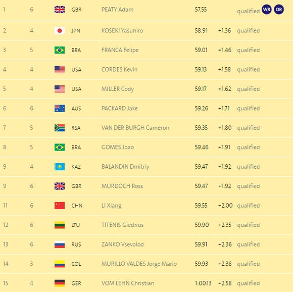 Στη δεύτερη θέση τερμάτισε ο Αυστραλός Τζέικ Πάκαρντ με 59.26 και τρίτος ο Ρός Μέρντοκ με 59.47. Στην ίδια σειρά κολύμπησε ο Παναγιώτης Σαμηλίδης ο οποίος ήταν έβδομος με χρόνο 1:00.35. Ο Έλληνας πρωταθλητής έκανε συνολικά τον 19ο χρόνο και έμεινε εκτός συνέχειας.
