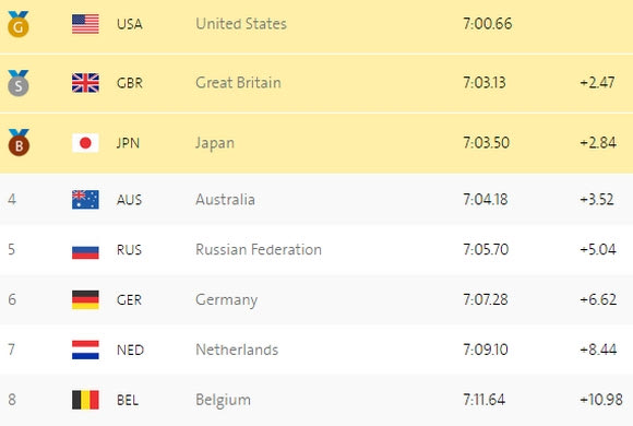 Οι Αμερικανοί ήταν το απόλυτο φαβορί και δεν αντιμετώπισαν κανένα πρόβλημα να φτάσουν στη νίκη με 7:00.66, αφήνοντας δεύτερη με 7:03.13 τη Μεγάλη Βρετανία, που τους είχε κερδίσει πέρυσι στο Παγκόσμιο του Καζάν, και τρίτη με 7:03.50 την Ιαπωνία.