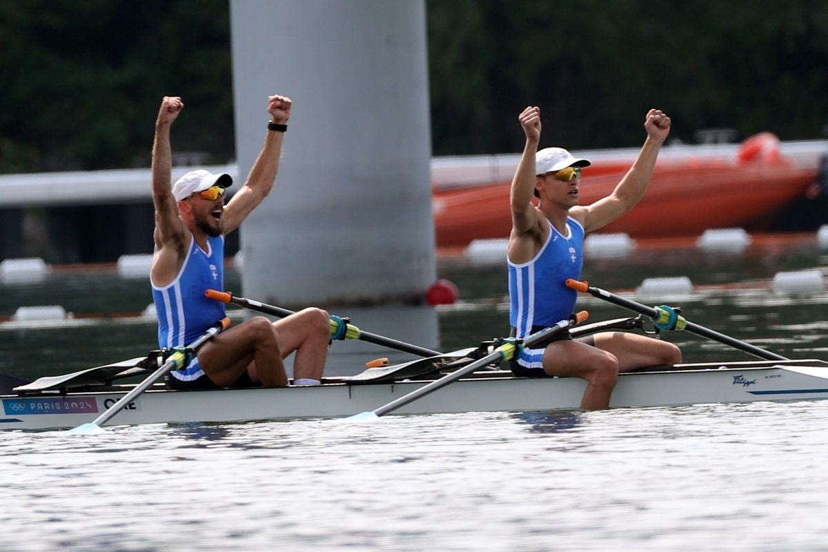 Το δίδυμο των Παπακωνσταντίνου και Γκαϊδατζή κατέκτησαν το χάλκινο στο διπλό σκιφ ελαφρών βαρών ανδρών γράφοντας ιστορία στο Παρίσι. Μετά την απονομή του μεταλλίου τους, οι Έλληνες κωπηλάτες έκαναν δηλώσεις στην κάμερα της ΕΡΤ.