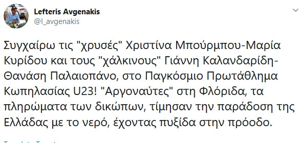 Ο υφυπουργός, Λευτέρης Αυγενάκης, έστειλε τα συγχαρητήριά του: “Συγχαίρω τις “χρυσές” Χριστίνα Μπούρμπου-Μαρία Κυρίδου και τους “χάλκινους” Γιάννη Καλανδαρίδη-Θανάση Παλαιοπάνο, στο Παγκόσμιο Πρωτάθλημα Κωπηλασίας U23! “Αργοναύτες” στη Φλόριδα, τα πληρώματα των δικώπων, τίμησαν την παράδοση της Ελλάδας με το νερό, έχοντας πυξίδα στην πρόοδο”.