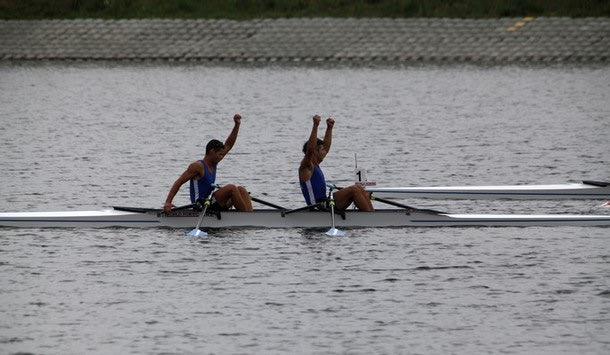 BREST, BELARUS - JULY 25: The BLM2x team from Greece Panagiotis Magdanis, Eleftherios Konsolas celebrate victory during the FISA World Rowing U23 Championships at The Brest Rowing Course on July 25, 2010 in Brest, Belarus. (Photo by Piotr Malecki/Getty Images)