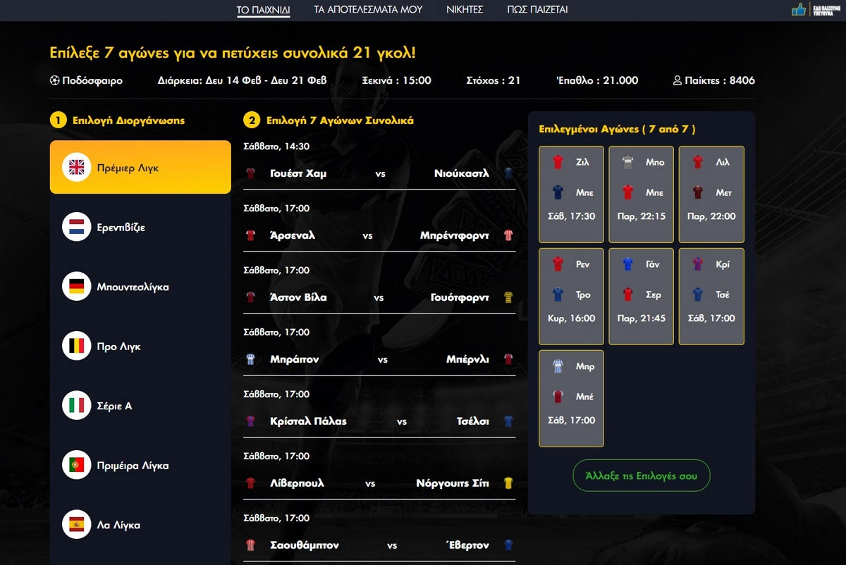 Από τη σελίδα του Pamestoixima.gr επιλέγεις 7 αγώνες από 9 ευρωπαϊκά πρωταθλήματα (Ελλάδα, Αγγλία, Γερμανία, Ιταλία, Ισπανία, Γαλλία, Πορτογαλία, Ολλανδία, Βέλγιο) κάθε εβδομάδα και κερδίζεις αν σημειωθούν στα παιχνίδια τους συνολικά 21 γκολ. Η συμμετοχή είναι δωρεάν για όλους. Με το Golden 21 οι παίκτες του Pamestoixima.gr προβλέπουν σε ποιους 7 αγώνες θα μπουν ακριβώς 21 γκολ και διεκδικούν έως και 21.000 ευρώ κάθε εβδομάδα/αγωνιστική ή ακόμα και το μεγάλο έπαθλο του 1.000.0000 ευρώ!
