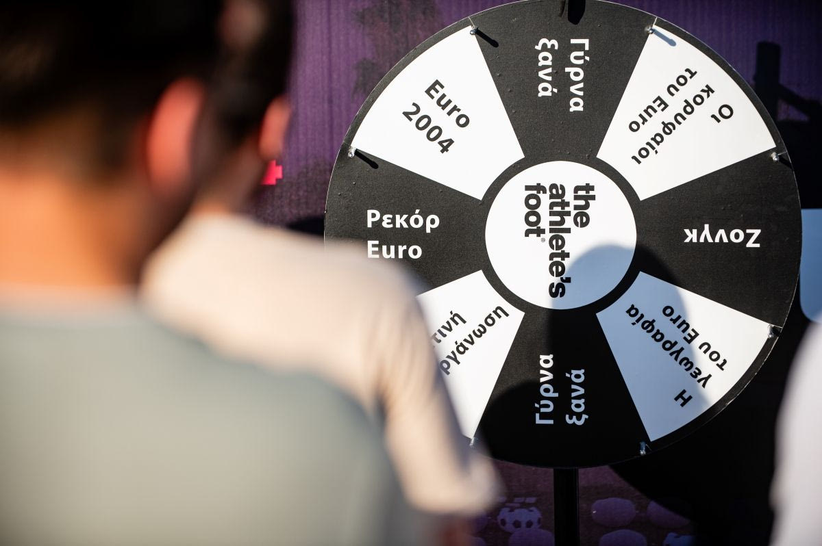 Δεύτερο κι εξίσου βασικό, The Athlete’s Foot. Ο χώρος με τα παπούτσια και τα ρούχα, και τον τρόχο της τύχης γύρω από τον οποίο μαζεύτηκαν όλοι πριν τον τελικό. Κάθε στροφή και μια κατηγορία ερωτήσεων για το Euro, παρελθόν και παρόν. Κάθε σωστή απάντηση και κάθε αναγνώστης κέρδιζε 15% έκπτωση και έβαζε και το όνομά του σε κληρώσεις για δωροεπιταγές.