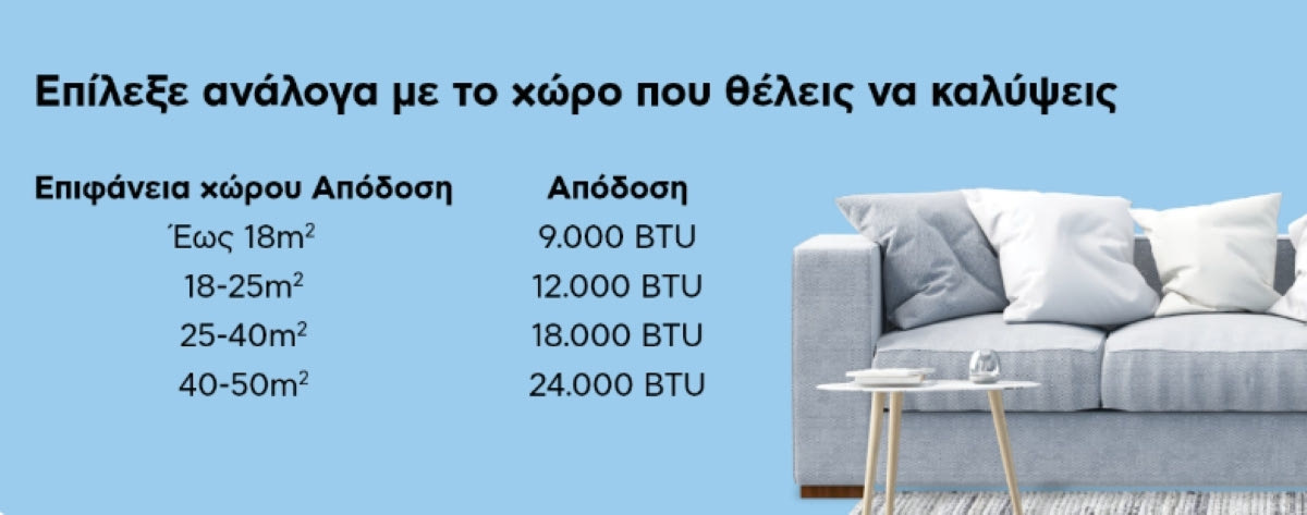 Μην αγχώνεσαι. Και εδώ υπάρχει μπούσουλας. Απλά ακολούθησε τον. Για έναν χώρο 40m² – 50m² θα χρειαστείς ένα 24.000 BTU κλιματιστικό για να τον καλύψεις πλήρως. Για δωμάτιο από 25m² -40m² τα ιδανικά BTU είναι τα 18.000 ενώ για χώρους 18m² -25m² προτείνεται ένα air-condition των 12.000BTU. Εάν πάλι ενδιαφέρεσαι να δροσίσεις ένα δωμάτιο κάτω των 18m² τότε χρειάζεσαι ένα των 9.000 BTU.