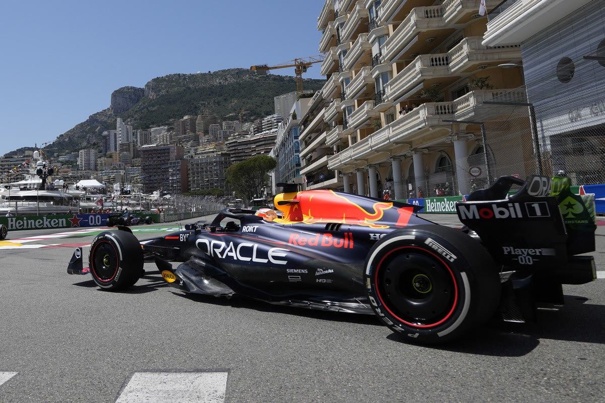 Red Bull driver Max Verstappen of the Netherlands pulls onto the track during the Formula One first practice session at the Monaco racetrack, in Monaco, Friday, May 26, 2023. The Formula One race will be held on Sunday. (AP Photo/Luca Bruno)