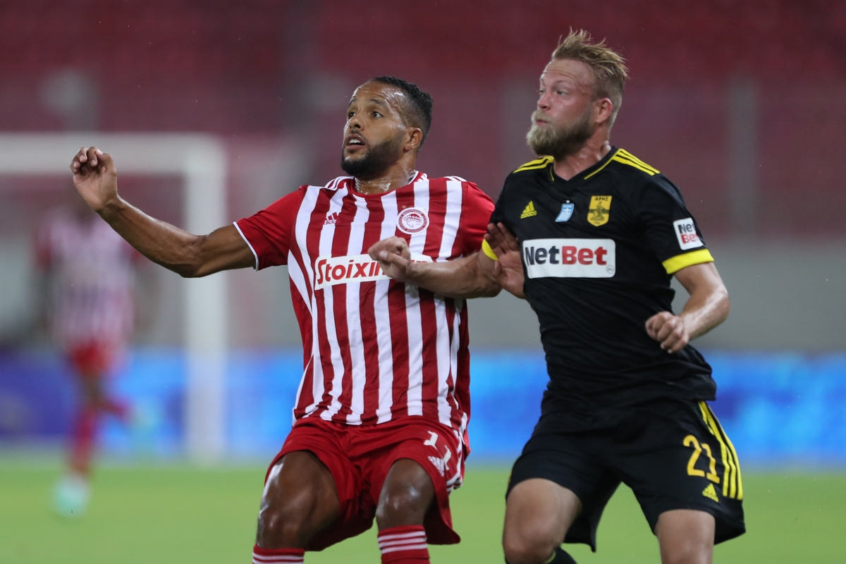 Ο Αραμπί με τον Σούντγκρεν δίνουν μάχη για την μπάλα στο Ολυμπιακός - Άρης