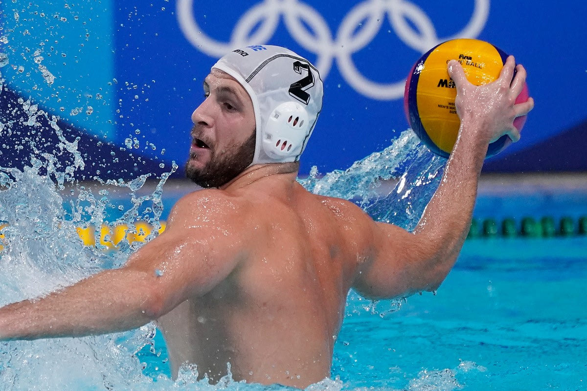 Greece's Konstantinos Genidounias plays against Japan during a preliminary round men's water polo match at the 2020 Summer Olympics, Thursday, July 29, 2021, in Tokyo, Japan. (AP Photo/Mark Humphrey)
