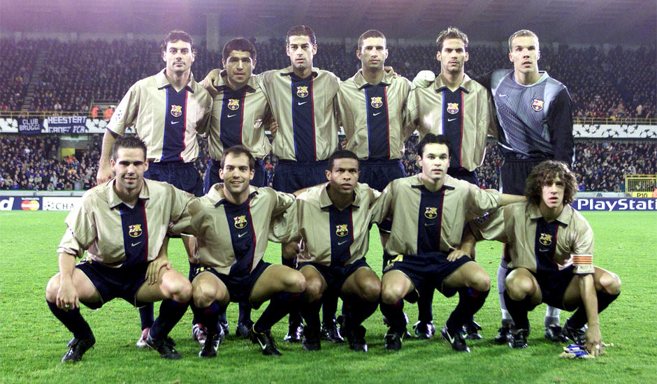 Η πρώτη επίσημη συμμετοχή του Ινιέστα με την πρώτη ομάδα της Μπαρτσελόνα. Πίσω, από αριστερά, Ντάνι, Ρικέλμε, Ζεράρ, Ρόσενμπακ, Τορτολέρο, Ένκε. Μπροστά, από αριστερά, Φερνάντο Ναβάρο, Γκάμπρι, Ζεοβάνι, Ινιέστα, Πουγιόλ (Όμιλοι Champions League, Μπριζ – Μπαρτσελόνα 0-1, 29/10/2002)