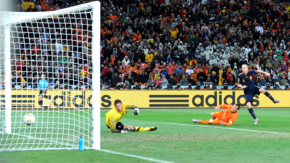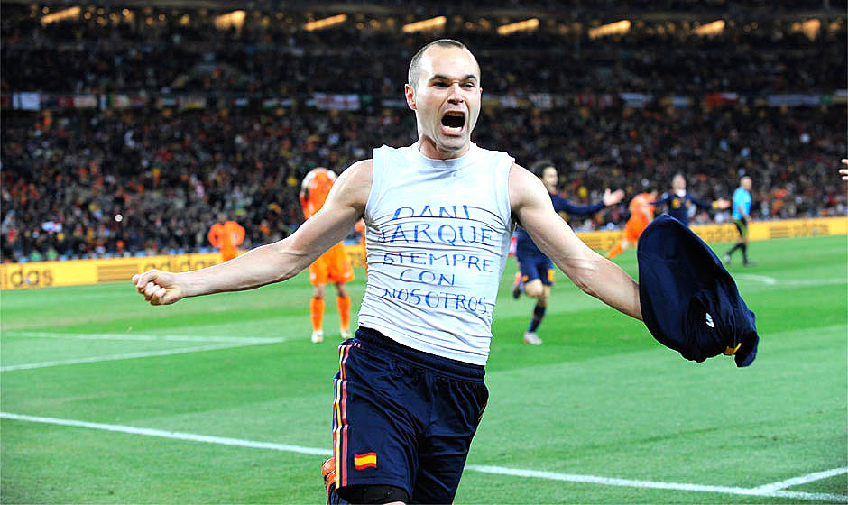 Το βράδυ της 11ης Ιουλίου του 2010, η Ισπανία είχε ραντεβού με την ιστορία, εκείνος όμως που είχε τα κλειδιά για να ξεκλειδώσει την ολλανδική άμυνα, ήταν ο Ινιέστα. Στο “Soccer City” του Γιοχάνεσμπουργκ, το ματς ήταν χωρίς σκορ στη λήξη του 90λεπτου. Οι Ολλανδοί ήταν τυχεροί που έπαιζαν ακόμα με 11, αφού ο Χάουαρντ Γουέμπ είχε αρνηθεί την πεντακάθαρη απευθείας κόκκινη στον Ντε Γιονγκ, μετά το δολοφονικό του μαρκάρισμα στον Τσάμπι Αλόνσο. Η αγωνία είχε κορυφωθεί, όλα έδειχναν ότι τα πέναλτι θα έδιναν τελικά τη λύση, όμως ήρθε το 116′ και μαζί του το γέμισμα στην περιοχή του Τόρες, η πάσα του Φάμπρεγας στον Ινιέστα και το ιδανικό πλασέ του Αντρές, που πρόλαβε το τάκλιν του Ράφαελ Φαν ντερ Φάαρτ και έστειλε τη μπάλα στα δίχτυα του Μάαρτεν Στεκέλενμπουργκ, μέσα σε καθολικό ντελίριο των Ισπανών φιλάθλων που βρίσκονταν στις κερκίδες, στην Ισπανία και σε οποιαδήποτε γωνιά του πλανήτη! Πριν προλάβουν οι συμπαίκτες του να γίνουν ένα κουβάρι μαζί του, ο Ινιέστα έβγαλε τη φανέλα του, αποκαλύπτοντας από μέσα ένα αμάνικο μπλουζάκι, το οποίο έγραφε: “Dani Jarque, siempre con nosotros” (Ντάνι Χάρκε, πάντα μαζί μας), μια συγκλονιστική αφιέρωση στον – ένα χρόνο νωρίτερα – πρόωρα χαμένο αρχηγό της Εσπανιόλ.