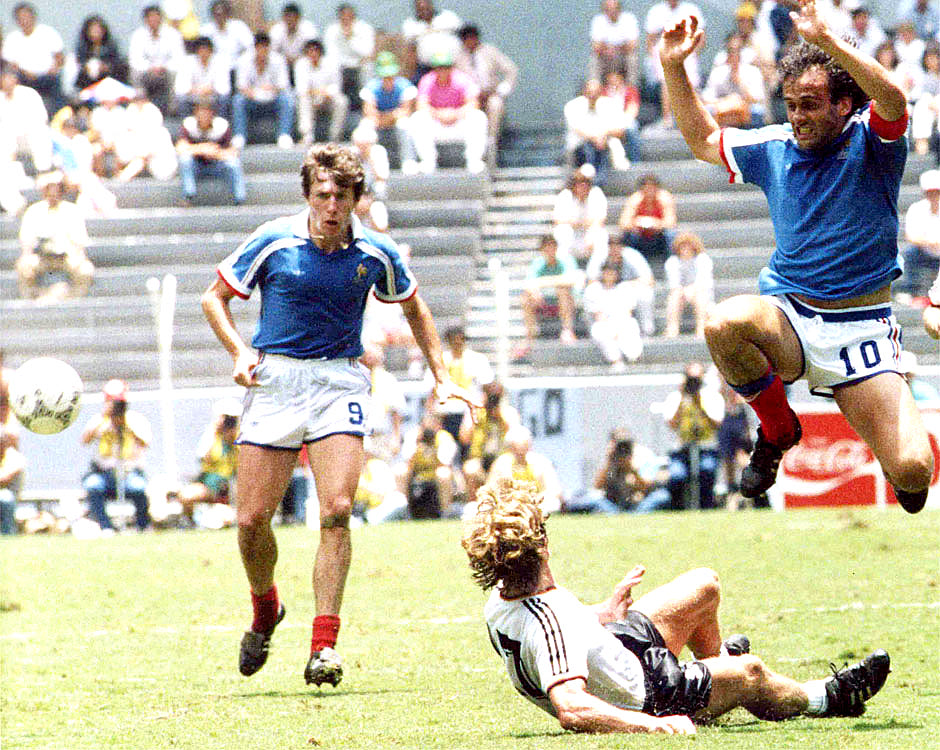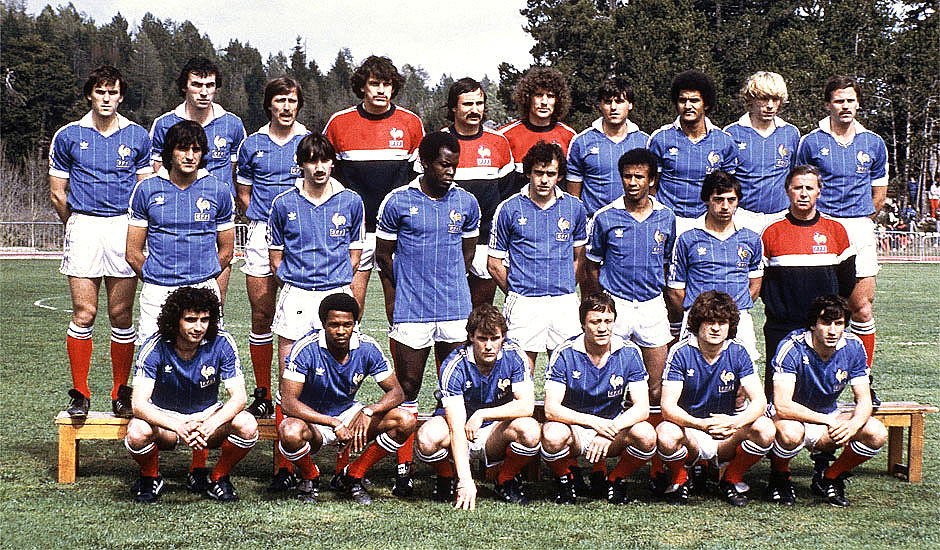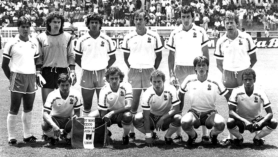 Συνεχίζουμε με μια ακόμα ομάδα, η οποία “έλαμψε” στο ίδιο Μουντιάλ, εκείνο του 1982. Η Εθνική Γαλλίας μέχρι τότε δεν είχε να επιδείξει κάτι αξιόλογο στα Παγκόσμια Κύπελλα, εκτός από την τρίτη θέση του 1958 στη Σουηδία. Η ομάδα των μεγάλων Ραϊμόν Κοπά και Ζιστ Φοντέν είχε αποκλειστεί στον ημιτελικό από τη μετέπειτα κάτοχο Βραζιλία (5-2), αλλά είχε διαλύσει στον μικρό τελικό τη Δυτική Γερμανία με το εντυπωσιακό 6-3 (καρέ του Κοπά). Στο ξεκίνημα όμως της δεκαετίας του ’80, μια χαρισματική γενιά ποδοσφαιριστών, δημιούργησε ένα εκπληκτικό σύνολο, προορισμένο να πρωταγωνιστήσει. Ο εκλέκτορας Μισέλ Ινταλγκό είχε στη διάθεσή του μια ατελείωτη λίστα προικισμένων με αστείρευτο ταλέντο παικτών: Μανουέλ Αμορός, Πατρίκ Μπατιστόν, Μαξίμ Μποσίς, Ζεράρ Ζανβιόν, Μαριούς Τρεζόρ, Μπερνάρ Ζενγκινί, Αλέν Ζιρές, Ζαν Τιγκανά, Ντομινίκ Ροστό, Ντιντιέ Σιξ και φυσικά τον μεγάλο ηγέτη εκείνης της Εθνικής, Μισέλ Πλατινί. Οι “τρικολόρ” ταξίδεψαν στην Ισπανία με μεγάλες φιλοδοξίες, ξεκίνησαν όμως τις υποχρεώσεις τους με το… “αριστερό”, αφού ηττήθηκαν στο πρώτο παιχνίδι του ομίλου 3-1 από την Αγγλία, μέσα στο “Σαν Μαμές”. Οι Άγγλοι άνοιξαν το σκορ μόλις στο 1′ με τον Μπράιαν Ρόμπσον, δέχτηκαν την ισοφάριση στο 24′ από τον Σολέρ, όμως στη συνέχεια πέτυχαν δυο ακόμη τέρματα με τους Ρόμπσον και Μάρινερ, “προσγειώνοντας” ανώμαλα τους Γάλλους.