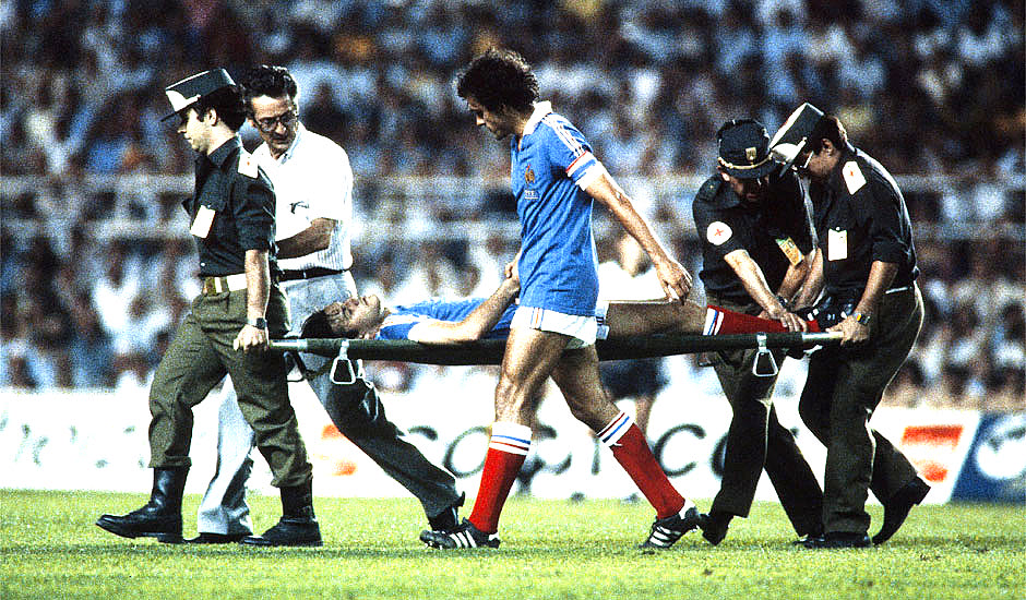 Ο Πατρίκ Μπατιστόν αποχωρεί από τον αγωνιστικό χώρο μετά το δολοφονικό χτύπημα του Σούμαχερ, ενώ τον συνοδεύει σοκαρισμένος ο Μισέλ Πλατινί.