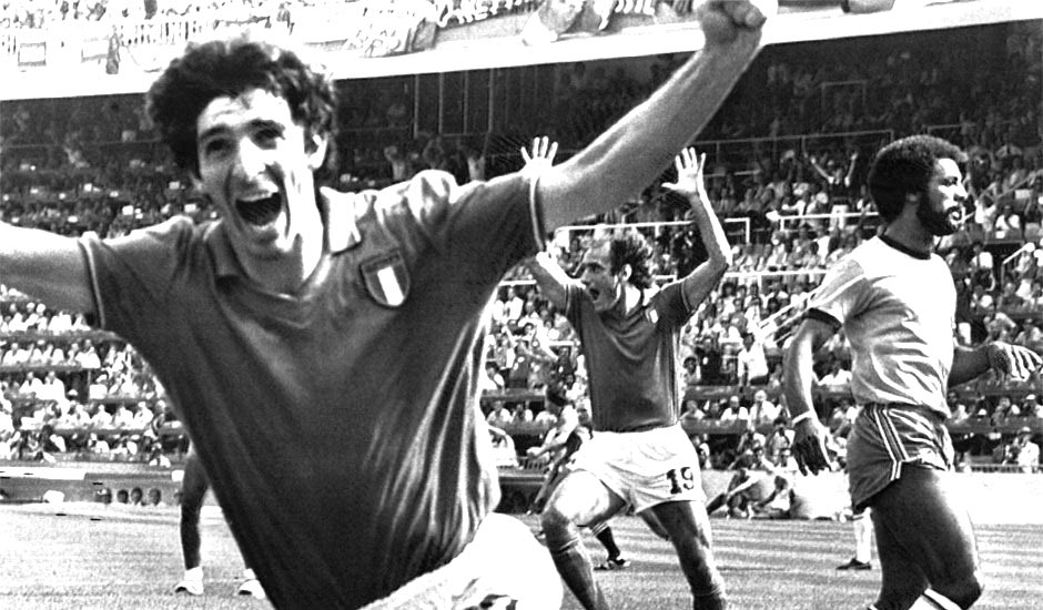 Ο Πάολο Ρόσι πανηγυρίζει το δεύτερο γκολ του εναντίον της Βραζιλίας, στο τελευταίο ματς της δεύτερης φάσης του Μουντιάλ 1982. Πίσω δεξιά ο Ζούνιορ και στη μέση ο Φραντσέσκο Γκρατσιάνι (AP Photo)