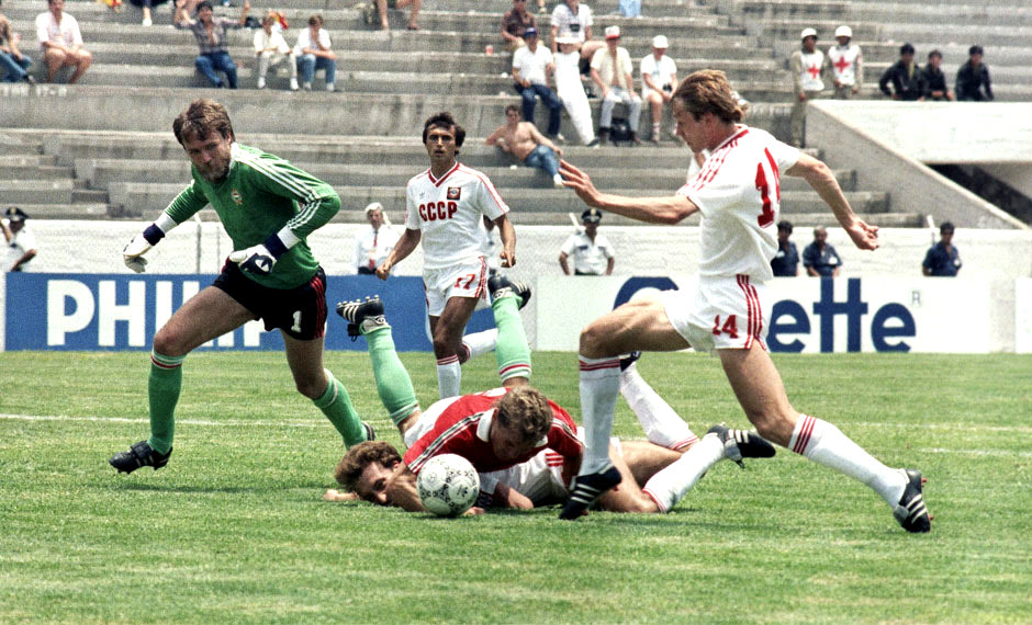 Ο Σεργκέι Ροντιόνοφ (δεξιά) είναι έτοιμος να σκοράρει εναντίον της Ουγγαρίας (όμιλοι Μουντιάλ 1986), με εξουδετερωμένο τον τερματοφύλακα Πέτερ Ντιστλ, ενώ παρακολουθεί στο βάθος ο Βαντίμ Γεφτουσένκο (AP Photo)