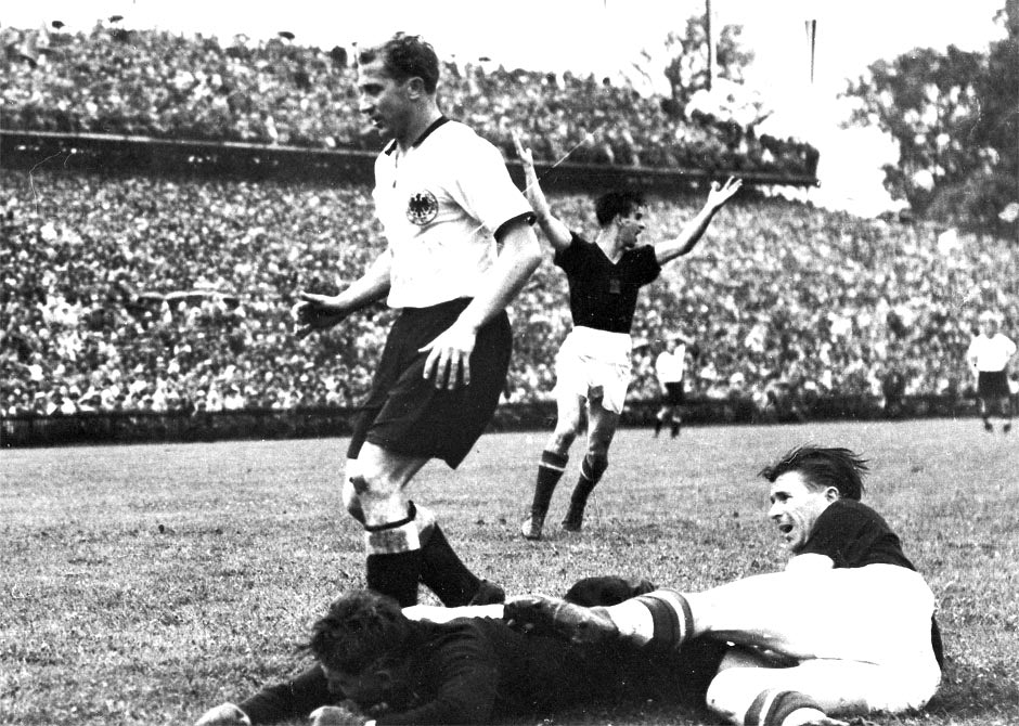 Ο Πούσκας (πεσμένος δεξιά) έχει σκοράρει λίγο πριν τη λήξη στον τελικό του Μουντιάλ του 1954, αλλά το γκολ έχει ακυρωθεί ως οφσάιντ, διατηρώντας το προβάδισμα των Γερμανών (3-2). Ο Άντον Τούρεκ, γκολκίπερ της Δ. Γερμανίας και ο αμυντικός Βέρνερ Λίμπριχ (όρθιος), παρακολουθούν τη μπάλα που έχει καταλήξει στα δίχτυα (AP Photo)