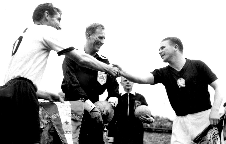 Χαιρετισμός ανάμεσα στους δυο αρχηγούς, πριν τον τελικό του 1954. Δεξιά ο Φέρεντς Πούσκας και αριστερά ο Φριτς Βάλτερ, με τον Άγγλο διαιτητή, Γουίλιαμ Λινγκ, να παρακολουθεί (AP Photo)