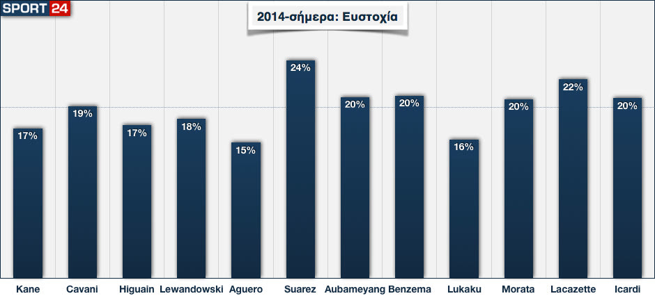 Βασιλιάς ο Σουάρες, που εκτελεί με 24%, χρειάζεται σχεδόν τέσσερις τελικές για να βρει δίχτυα. Ακολουθούν Λακαζέτ, Μπενζεμά, Ομπαμεγιάνκ και Ικάρντι, όλοι πάνω απ’το 20%, χρειάζονται πέντε ή και λιγότερες τελικές για να σκοράρουν.