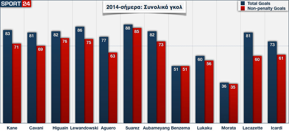 Ξεκινάμε με τα γκολ. Σύνολο τερμάτων απ’το καλοκαίρι του 2014 μέχρι και σήμερα. Και εννοείται πως εξετάζουμε όλα τα γκολ, αλλά και αυτά χωρίς πέναλτι. Δεν είναι όλοι οι σέντερ φορ οι εκτελεστές των πέναλτι στις ομάδες τους και γενικώς τα πέναλτι είναι μια ξεχωριστή διαδικασία.