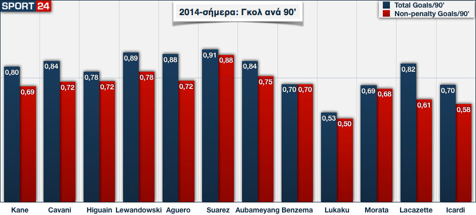Ο Σουάρες είναι και πάλι πρώτος, λίγο πάνω απ’τον Λεβαντόφκσι αν μετράμε με τα πέναλτι, αλλά πολύ μπροστά χωρίς αυτά. Ο Ουρουγουανός έχει 0.88 non-penalty goals κάθε 90′, βρίσκει δηλαδή δίχτυα κάθε 102 λεπτά, ενώ κανείς άλλος σέντερ φορ δεν ξεπερνάει το 0.80.