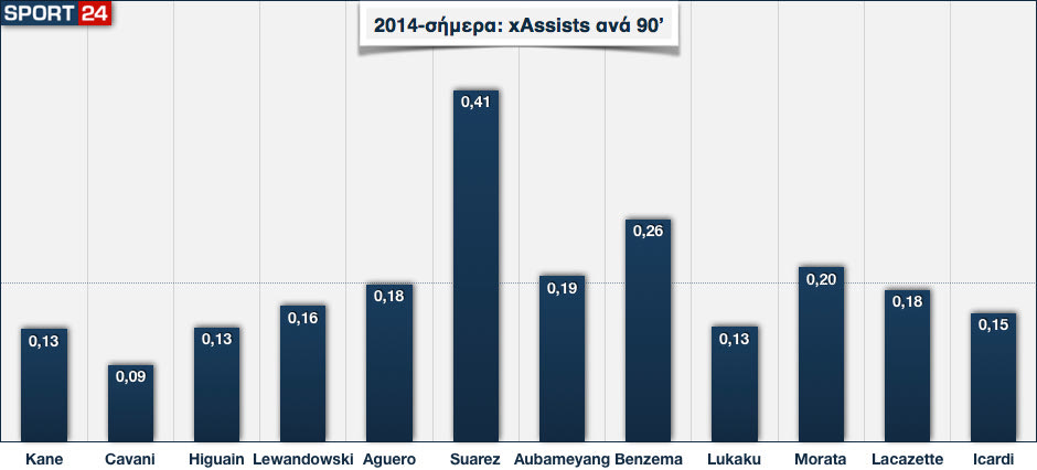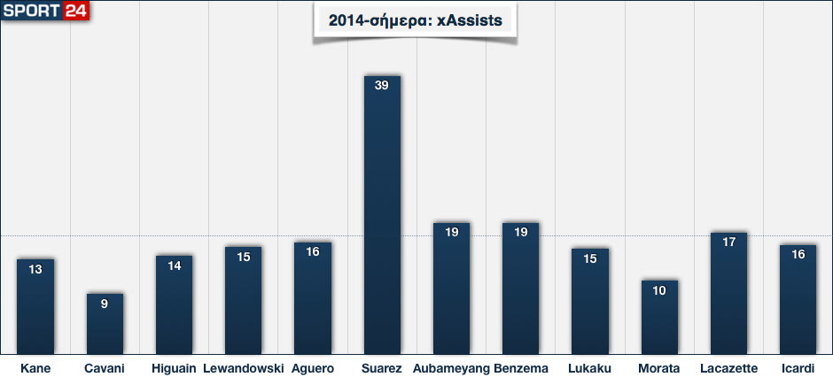 Απόλυτος κυρίαρχος ο Σουάρες. Ο Ουρουγουανός όχι μόνο είναι ο κορυφαίος σκόρερ (όσον αφορά την ποσότητα των γκολ), αλλά είναι και ο κορυφαίος δημιουργός. Ο φορ της Μπαρτσελόνα έχει υπερδιπλάσιο αριθμό xAssists απ’τον μέσο όρο, τους αφήνει όλους χιλιόμετρα πίσω.