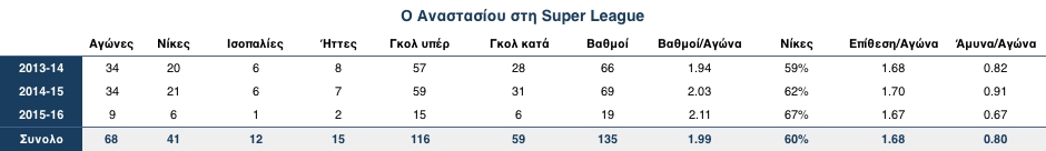 Ο Γιάννης Αναστασίου έχει πολύ περισσότερα παιχνίδια στον πάγκο του Παναθηναϊκού, αφού ο Έλληνας τεχνικός συμπλήρωσε δύο γεμάτες σεζόν πριν φύγει μετά από εννιά αγώνες πέρσι. Όμως, σε όλες τις σεζόν ο Αναστασίου κέρδιζε περισσότερους βαθμούς ανά αγώνα και είχε μεγαλύτερο ποσοστό νικών.