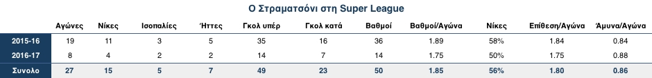 Συνολικά ο Αντρέα Στραματσόνι έχει καθίσει στον πάγκο του Παναθηναϊκού σε 27 παιχνίδια Super League, χωρίς να υπολογίζονται αυτά των Play-off. Ούτε στα 19 περσινά ματς, ούτε στα φετινά οκτώ (με την ομάδα που έφτιαξε ο ίδιος) δεν έχει καταφέρει να φτάσει το 60% στις νίκες ή να φτάσει να κερδίζει δύο βαθμούς ανά αγώνα.