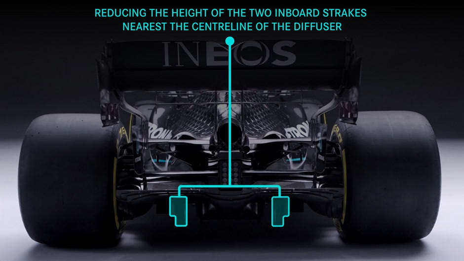 Η FIA, για να ελέγξει τη θηριώδη άντωση, μείωσε τις διαστάσεις του δαπέδου αφαιρώντας μια μακρόστενη τρίγωνη επιφάνεια από τις δύο πίσω πλευρές του και απαγόρευσε τις οπές (κεντρική φωτογραφία). Πλέον το δάπεδο πρέπει να είναι συμπαγές, και μάλιστα να έχει ακόμα λιγότερη ελαστικότητα στην πίεση του αέρα. Ακόμη, μείωσε το πλάτος των κεντρικών κάθετων τοιχωμάτων του διαχύτη κατά 50 χλστ, και των μικρών κάτω πτερυγίων των αεραγωγών των φρένων κατά 40 χλστ., στα 80 χλστ. (τα άνω πτερύγια παρέμειναν στα 120 χλστ.).